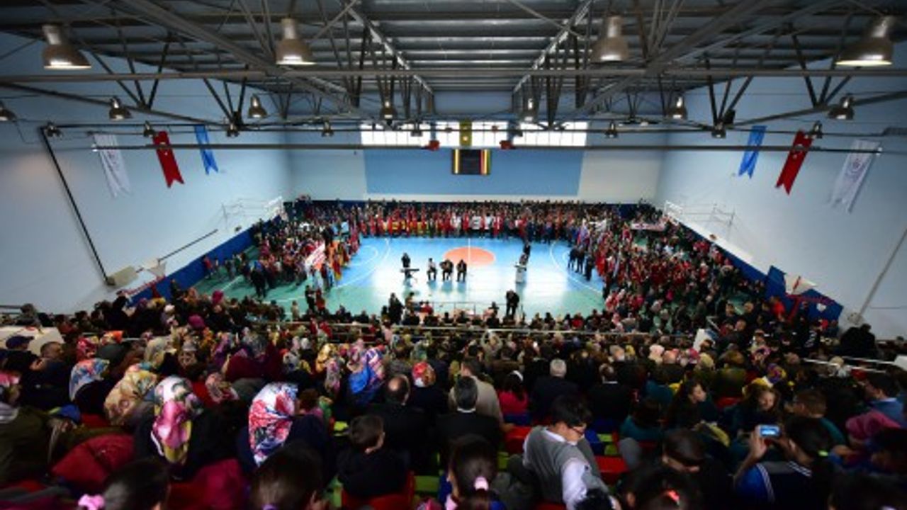 Yağmur nedeniyle Tosya İzzet Aksalur Spor Salonu'na alınan kutlamalar, saygı duruşu ve İstiklal Marşı'nın okumasıyla başladı.