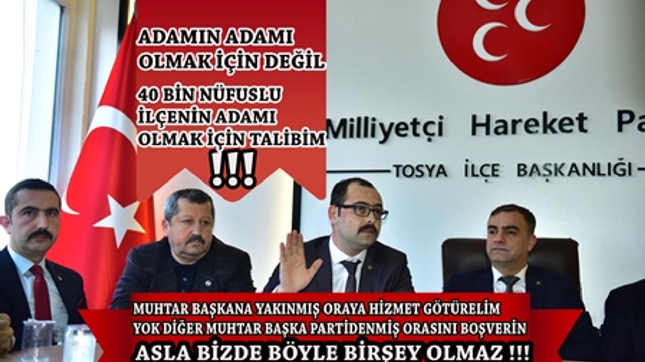 Artık Tosya’da herkes kafasından şunu çıkarsın; biz adamın adamı olmak için ya da adamlarımızı gözetmek için Milliyetçi Hareket Partili bir belediyeye talip değiliz. Biz Tosya’mızda yaşayan 40 bin nüfuslu vatandaşımızın derdiyle dertlenmek, sıkıntısıyla ilgilenmek için bu hizmete talibiz. Bundan hiç kimsenin şüphesi olmasın.