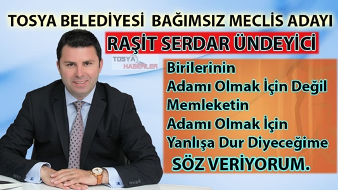 Raşit Serdar Ündeyici " Seçilirsem Belediye Meclisinde dün olduğu gibi bundan sonra da Tosya halkının çıkarlarını koruyacağım. Bağımsız belediye meclis üyeliği hakkında halkın pek bir bilgisi yok, ama yaklaşık 2000 oy alırsam Tosyalının haklarını mecliste savunabileceğim . İnşallah hedefimiz bu, bu doğrultuda esnaflarla istişare ediyoruz, desteklerini istiyoruz. Mevcut siyasi partilerin listelerini yetersiz gören seçmenlerin oylarına talibim. Meclis toplantılarında doğru ya doğru, yanlışa yanlış diyecek bağımsız ve tarafsız bir üyenin olması gerektiğini düşündüğüm için böyle bir karar aldım. Hayırlı olur inşallah" dedi.
