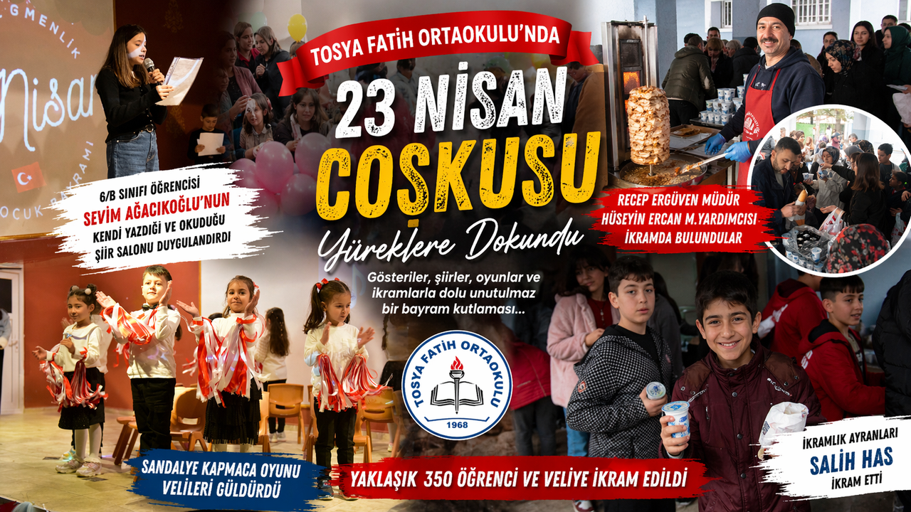 Kastamonu’nun Tosya ilçesinde bulunan Fatih Ortaokulu’nda, 23 Nisan Ulusal Egemenlik ve Çocuk Bayramı büyük bir coşku ve duygu seliyle kutlandı. Program, saygı duruşu ve İstiklal Marşı’nın okunmasıyla başladı; ardından sahne alan öğrencilerin hazırladığı gösteriler ve okudukları şiirler salondaki izleyicilerden büyük alkış aldı.