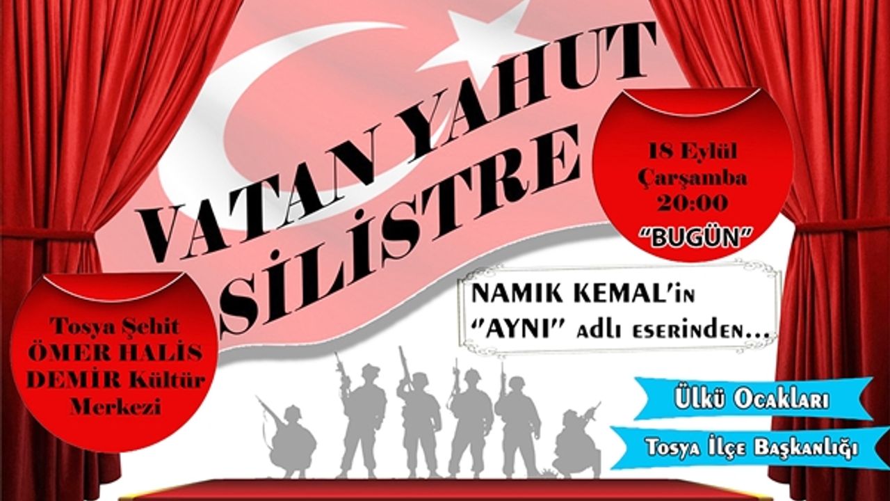 Kastamonu'nun Tosya İlçesinde ÜLKÜ OCAKLARI EĞİTİM VE KÜLTÜR VAKFI GENEL MERKEZİ’NİN hazırlayıp sunacağı “VATAN YAHUT SİLİSTRE “adlı tiyatro gösterimi 18 Eylül Çarşamba " Bugün " TOSYA BELEDİYESİ ŞEHİT ÖMER HALİS DEMİR KÜLTÜR MERKEZİ'de sahne alacak Tiyatro gösterisi ücretsiz olup tüm halk davetlidir.