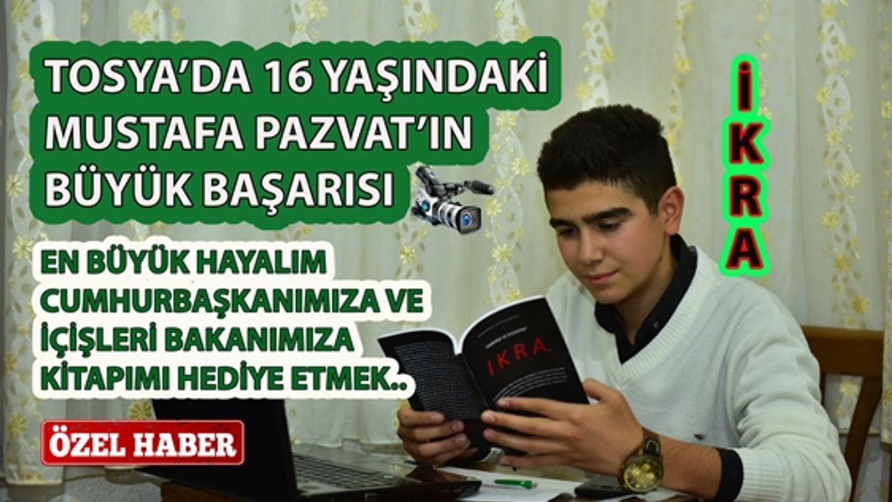 Kastamonu’nun Tosya İlçesi İmam Hatip Lisesi 2’inci sınıf öğrencisi 16 yaşındaki Mustafa Pazvat genç yaşında ‘’ İKRA ‘’isimli kitap yazdı Genç yaşına rağmen araştırmacı kimliği ile okulda ön plana çıkan Mustafa Pazvat geçtiğimiz yıl Kastamonu’da düzenlenen Genç Hatipler Minberde Hutbe okuma yarışmasında ikinci olarak büyük bir başarıya imza atmıştı. Eğitim hayatındaki başarısına önemli destek sağlayan ailesi çocuklarının ilk kitabının yayınlamanın gururunu yaşıyorlar.